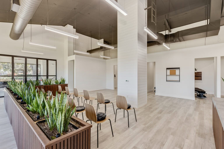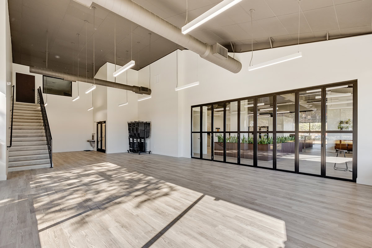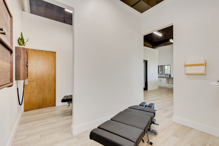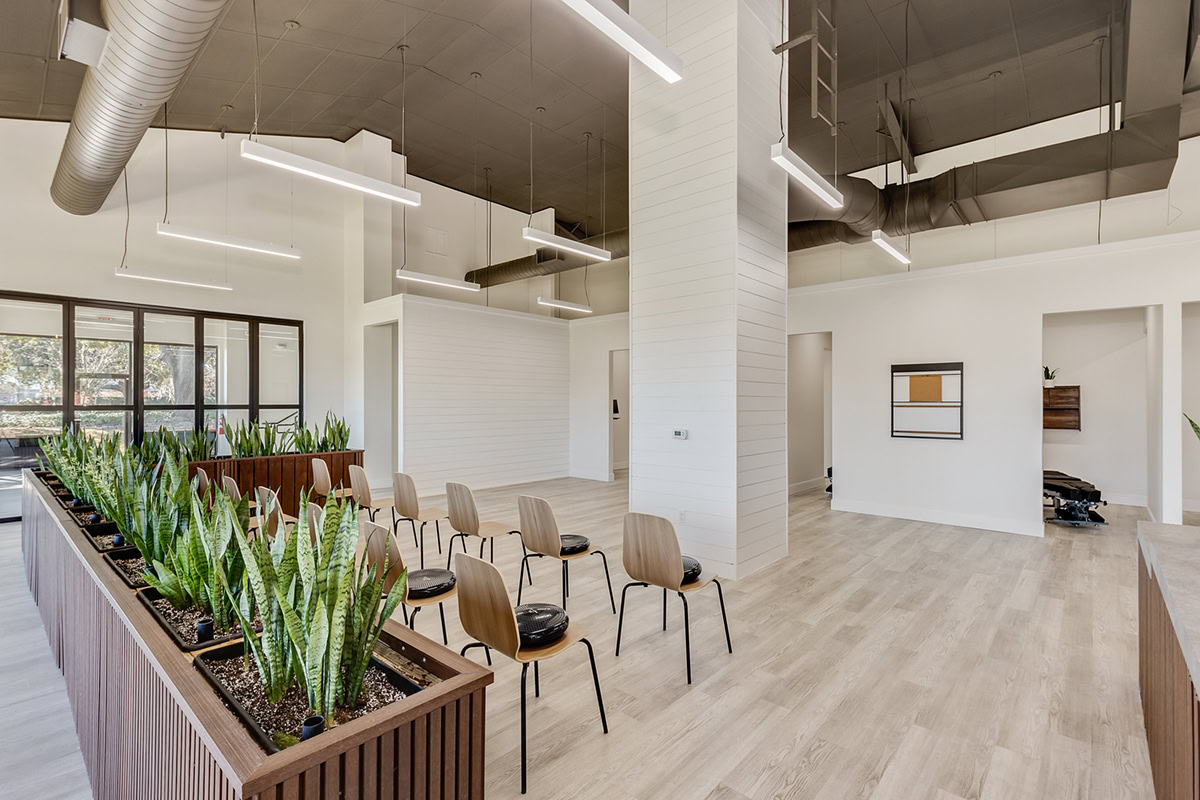 This complete transformation includes a large studio space, X-Ray room, multiple massage rooms, and a 2nd floor loft office with custom staircase. The incorporation of an architectural sliding glass wall, interior storefront glazing, exposed spiral duct, interior and exterior wood panelling, and linear pendant lighting all give the space a modern design.
