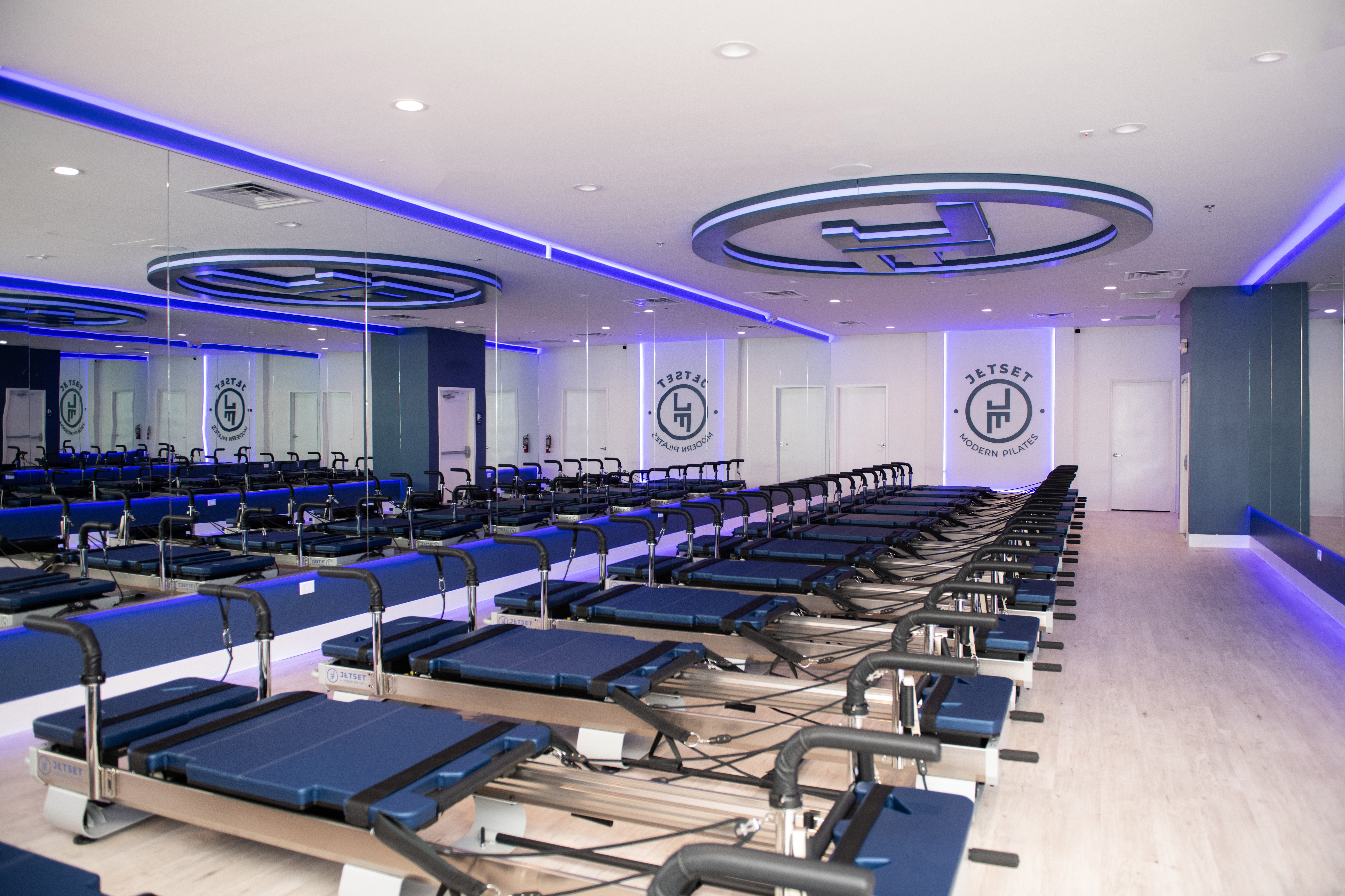 The studio features an open training area with mirrored walls, specialty flooring, and a carefully planned layout to accommodate multiple reformer stations. Accent lighting and ceiling details were incorporated throughout to create a cohesive, modern environment.